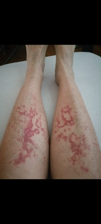 Pacientka hubená, ve výborném biologickém stavu, bez významných komorbidit / OA: osteoporoza, chron. vertegbrogení potíže t.č. vklidu, spondylolisteza L4/5, st.p. operaci šlach.kontraktury na ruce, hypercholest. Trombozu nikdy neměla, krvácivé komplikace v minulosti také ne. Celkově se cítí dobře. Základní biochemie v normě, FW nízké, ELFO bílkovin v normě, KO+diff v normě, Quick i APTT poměr v normě, APTT citl. na La v normě, antitrombin v normě, PS +PC v normě, antifosfolipidové protilátky /ACLA, beta-2-glykoprotein /v normě . Dále má hraniční hodnotu D dimeru 0,89 / norma 0-0,5/ a lehce positivní autoimunitu-ANF, ENA SS -A/Ro. ANCA jen sporně hraniční. Zda jde o projev purpury při zvýšeném venosním tlaku při dlouhodobém sezení , ale zvláštní, že pomáhá apixaban. Fotodokumentaci přikládám. Mnohokrát děkuji za Váš názor.