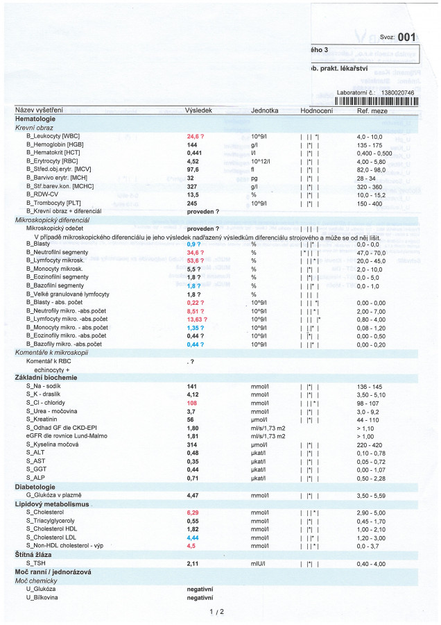 Dotaz: vzhledem k leukocytóze, přítomnosti blastů v periferní krvi, může se jednat o primárně hematologické onemocnění, prosím o event. návrh dalšího postupu, dovyšetření. Děkuji!